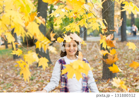 Melody of autumn. Falling leaves. Happy little girl wear headphones on autumn landscape. Cute child smile with stereo headphones. Small kid listening modern headphones. Headphones technology