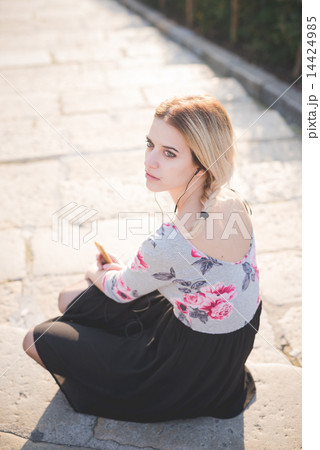 young beautiful blonde woman outdoor listening music