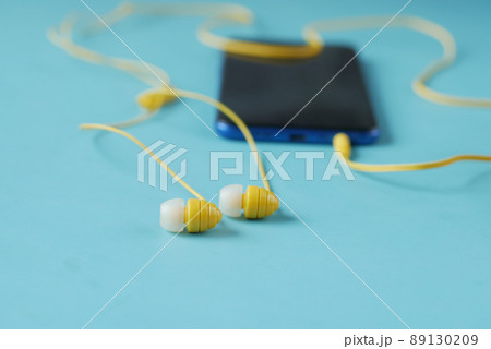 smart phone and headphone on wooden background .