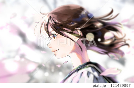 横顔の女学生イラストのカラー・桜あり・人物単体版
