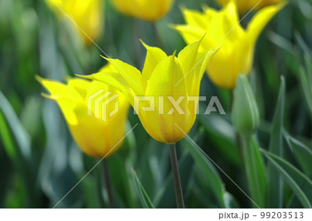 春の背景素材・春を誇る黄色いチューリップの花・横位置