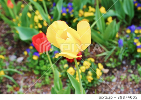 春の背景素材・春を誇る赤と黄色のチューリップの花・正方形