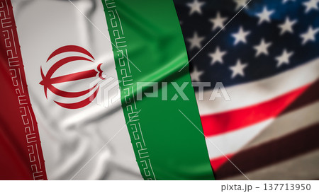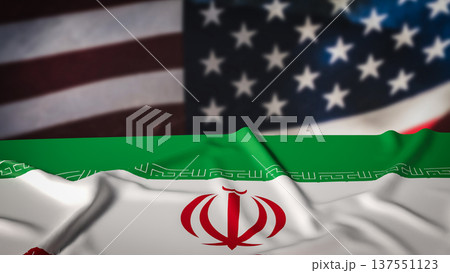 Iran National Flag With Blurred United States Flag Background Geopolitical Tension Concept 3d render.