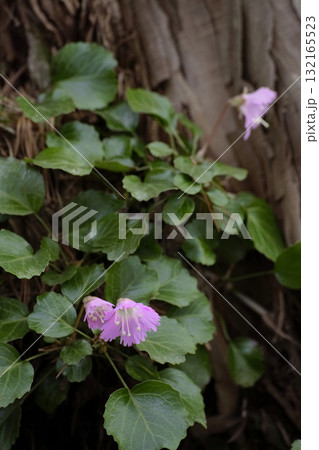 東京都奥多摩に咲く薄ピンク色のイワウチワの花の後ろ姿