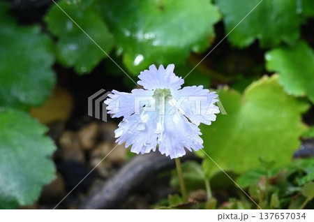日本の固有種である山林内で咲く白色の切れ込みにある花弁が綺麗なイワウチワ