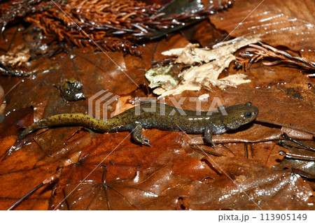 落ち葉の上のイワキサンショウウオ成体雄 左向き