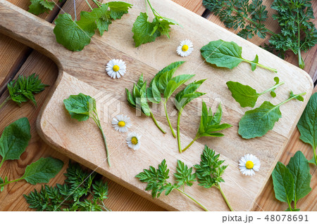 Young ground elder leaves on a table
