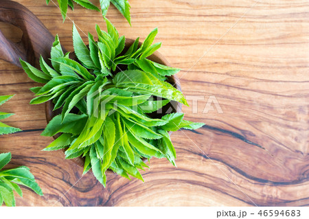 Young ground elder leaves on a wooden spoon