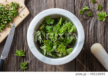 Young ground elder leaves in a mortar, top view