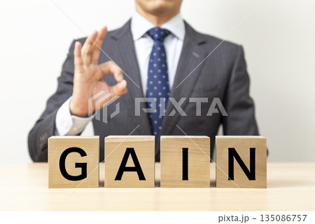 「GAIN」と書かれたブロックとOKポーズをするビジネスマン