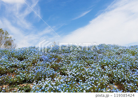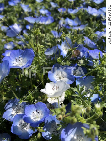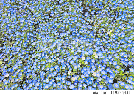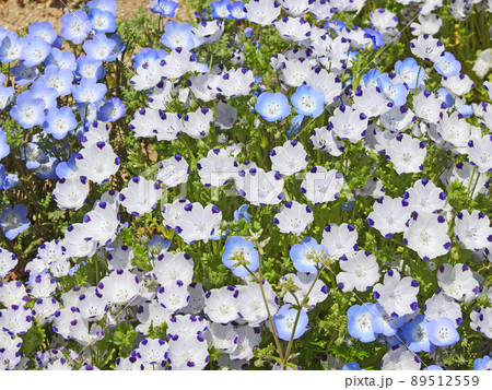 愛らしい青や白の花が咲く春のネモフィラ畑