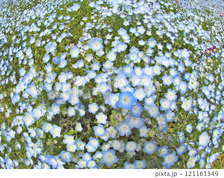 沢山のネモフィラの青い花が咲く草地のネモフィラの花を撮影した写真