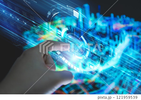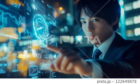 未来をホログラフィックディスプレイで操作するビジネスマン