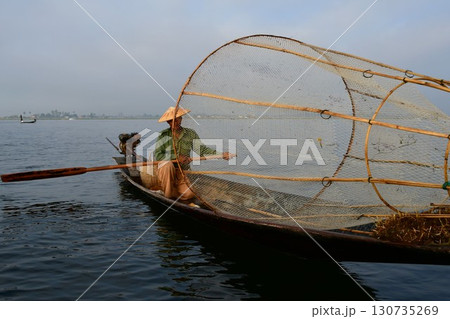 ミャンマー、インレー湖、インター族の漁師、魚とりの網、片足漕ぎ、小舟