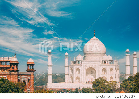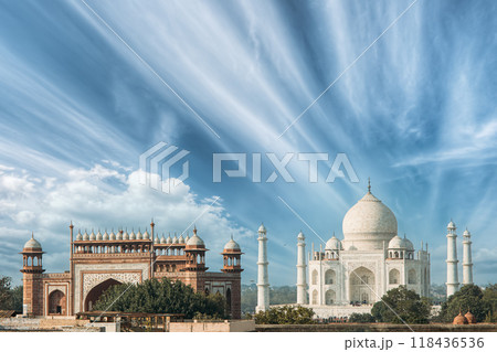 Taj Mahal in Agra, Uttar Pradesh, India. Seven 7 world wonders. Fabulous Taj mahal travel concept. indian islamic heritage at sunny day.