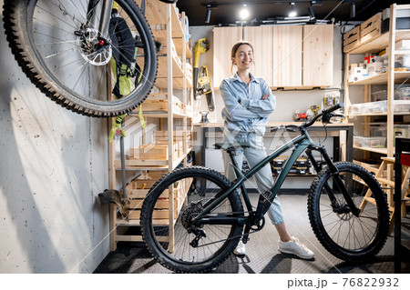 Busy hipster man bike mechanic removing rear wheel at garage workshop