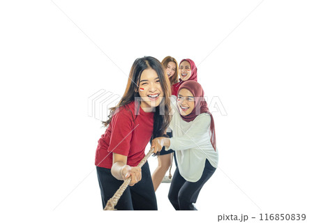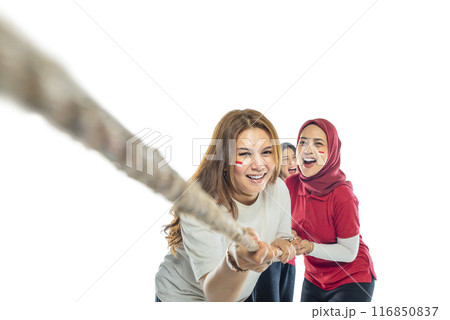 Portrait of Indonesian woman celebrate Indonesia Independence Day with traditional events like a tug of war contest
