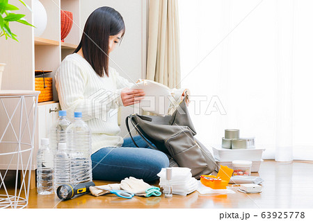 防災グッズを準備する女性 ポーチ 防災 避難 対策 備え コピースペース