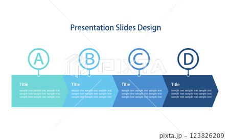 流れを示す4つの要素のインフォグラフィックス 16:9のプレゼンスライド資料のベクターのテンプレート