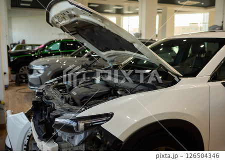 Showroom Display Featuring a Striking White Vehicle with an Open Hood for Maintenance Inspection