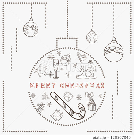Christmas contour illustration in the style of childrens doodles Christmas design elements in a Christmas ball a large candy