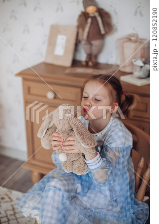 Cute smiling girl in white dress sitting next to Christmas tree in the room
