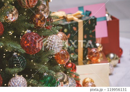 Beautiful miniature Christmas tree ornament decoration and a present used for banner and background or backdrop for seasonal greetings. Holiday winter season dreamy Christmas light.