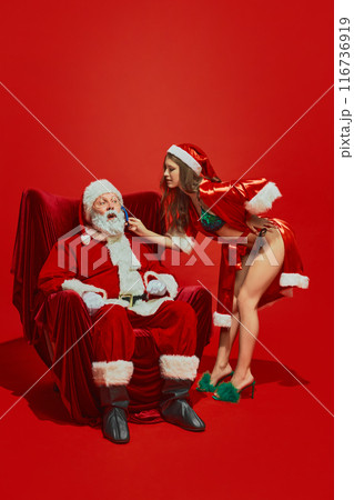 Young woman in silk gown and heeled shoes taking care after Santa Claus, shaving elderly man's face against red studio background