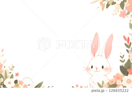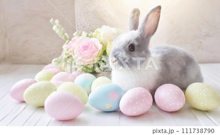 カラフルなイースターの卵とかくれんぼしているうさぎ