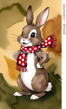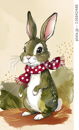 チョコレートケーキを食べるリボンを付けた白うさぎ