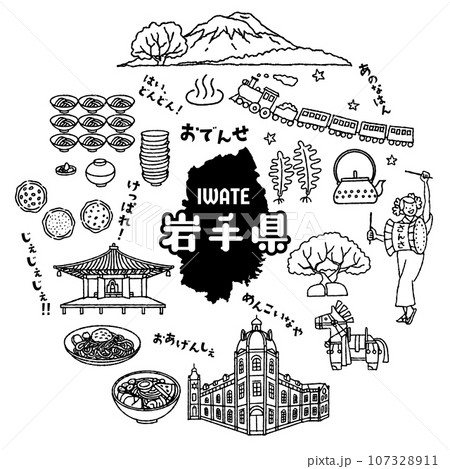 シンプルでかわいい岩手県にまつわるイラストセット(モノクロ)