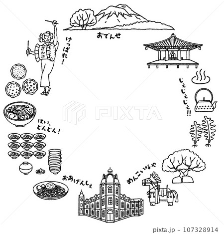 シンプルでかわいい岩手県にまつわるイラストの円形フレーム(モノクロ)