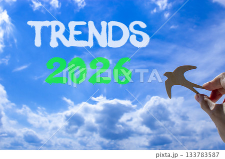 Trends 2026 new year symbol. Concept words Trends 2026 on beautiful blue sky. Beautiful blue sky background. Businessman's hand holds wooden bird. Business and Trends 2026 new year concept. Copy space