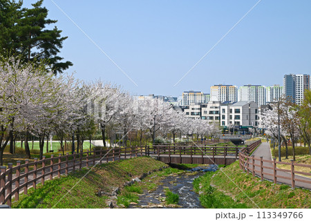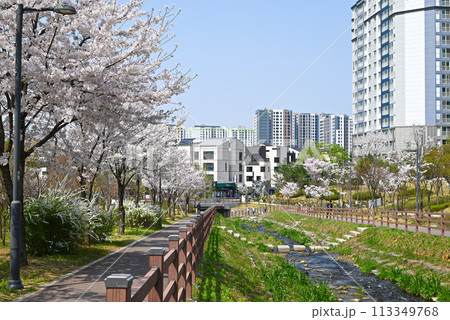 ソウル郊外 住宅街を流れる小川と桜並木【慰礼新都市】