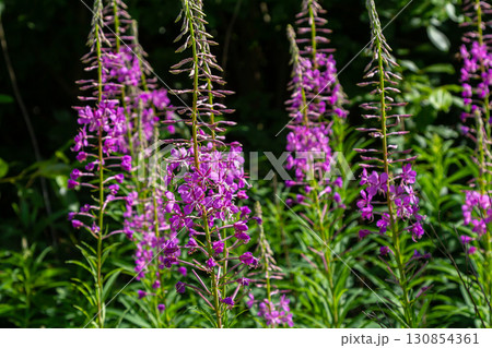 Wonderful flowering fireweed Chamaenerion angustifolium highlighted by the evening sun. A bunch of marvelous blossoming rosebay willowherbs