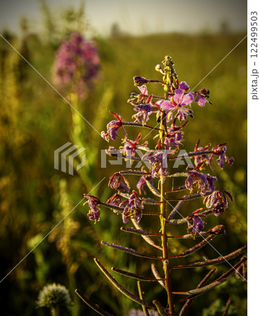 The stem of a blooming fireweed is covered with small drops of dew in a summer field under the rays of the morning sun