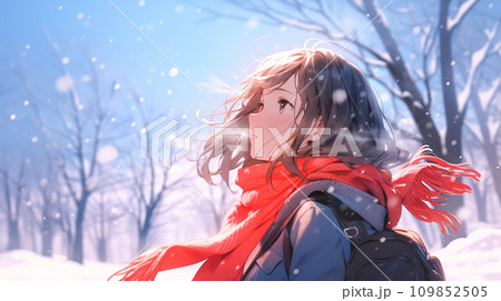 冬と女性のイラスト、雪降る空を見る女子高生 AI生成画像