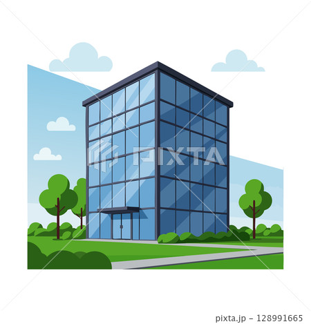 Modern glass office building with green trees and blue sky vector illustration
