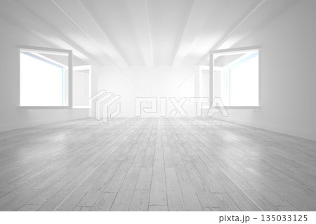 Empty modern interior space with large windows and sunlight casting shadows on white walls and floor, product placement or background. 3d rendering