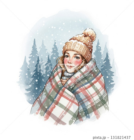 Watercolor Portrait of Woman Wrapped in Plaid Blanket Winter Forest Scene