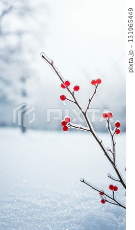 A delicate branch adorned with vibrant red berries is encased in glistening ice, standing prominently against a soft, sparkling white snow background on a bright winter day.