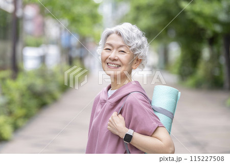 ヨガマットを持ったシニア女性 カメラ目線 笑顔