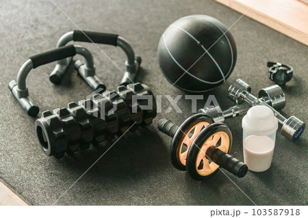 スポーツジムにあるダンベル・ボール・腹筋ローラー
