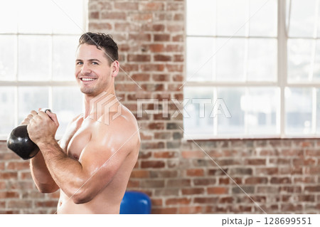 Handsome sportsman exercising with kettle bell at gym. Fit, sports and healthy lifestyle concept
