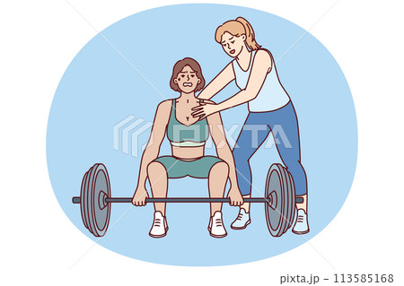 Strong athlete lifts heavy barbell under supervision of personal trainer from gym teaching ward