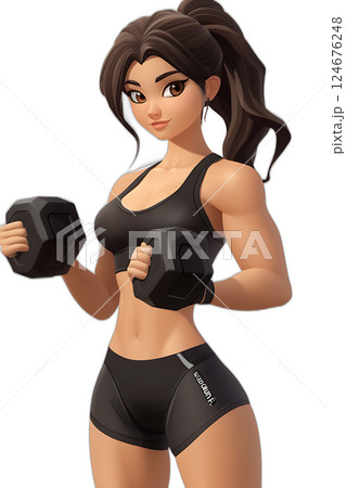 Animated female fitness trainer holding dumbbells, toned muscles, dynamic floating pose, transparent background