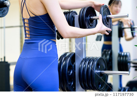 ジムで体を鍛える女性の背中、お尻 バーベルプレート ウェイト選び 筋トレ女子 ワークアウト