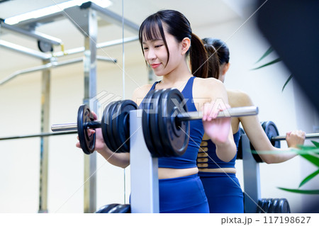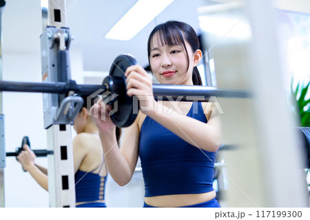 女性 トレーニング スポーツジム バーベル 笑顔