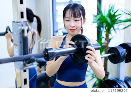 ジムで体を鍛える女性 バーベルプレート ウェイト選び 筋トレ女子 ワークアウト
