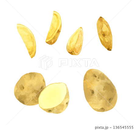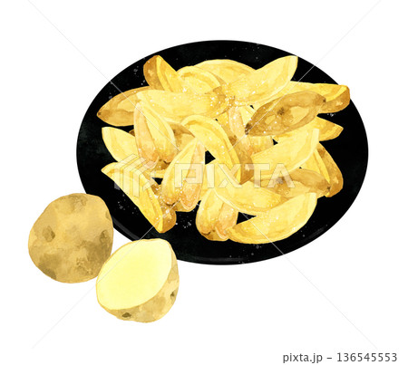ナチュラルカットの皮付きフライドポテトとじゃがいものセット 料理・食べ物の手描き水彩イラスト素材